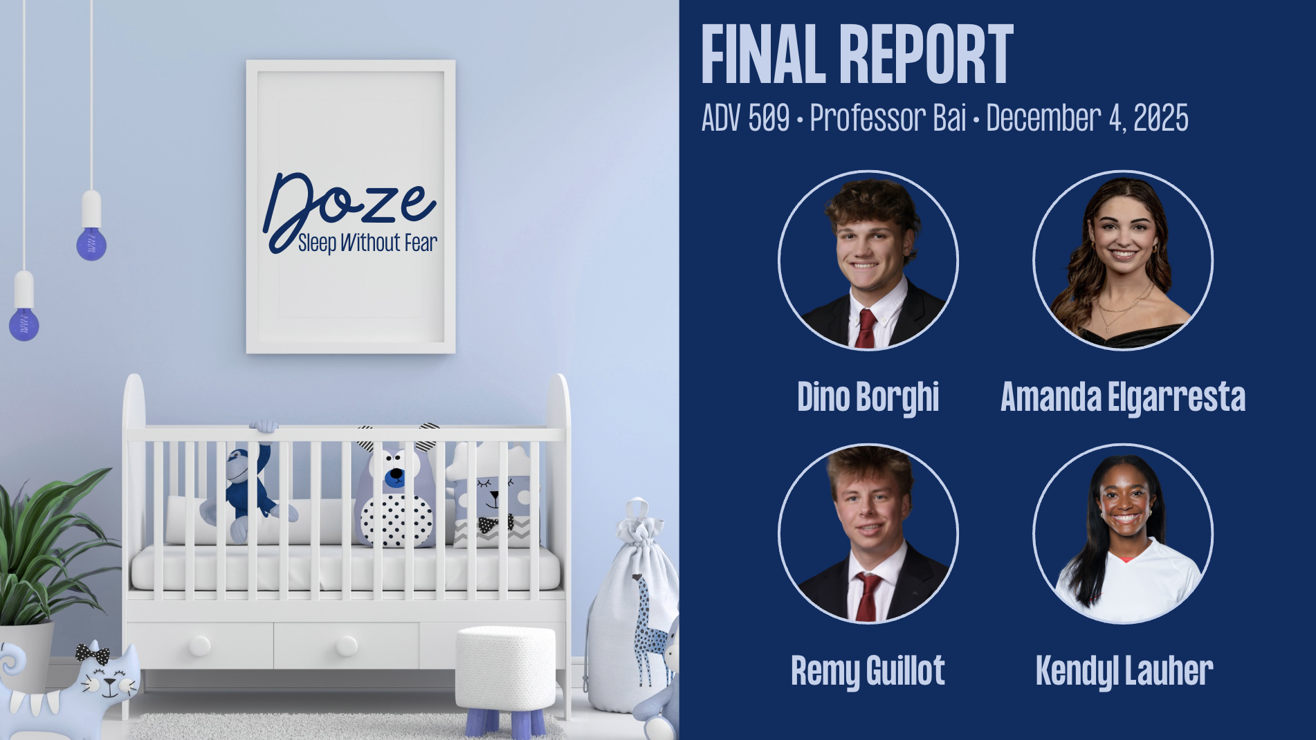 In my Advertising Research and Planning course, I helped develop a research-driven strategy for Doze, a conceptual smart crib designed to reduce nighttime anxiety for new parents. Our work focused on understanding how parents think about baby sleep technology and what actually drives trust and purchase in a high-stakes category. Using secondary research, qualitative interviews, and a quantitative survey, we identified safety and peace of mind as the primary decision drivers, far outweighing interest in advanced features. These insights informed a clear positioning strategy centered on reassurance and simplicity, guiding messaging, creative direction, and recommended channels based on how parents research, evaluate, and buy baby products.